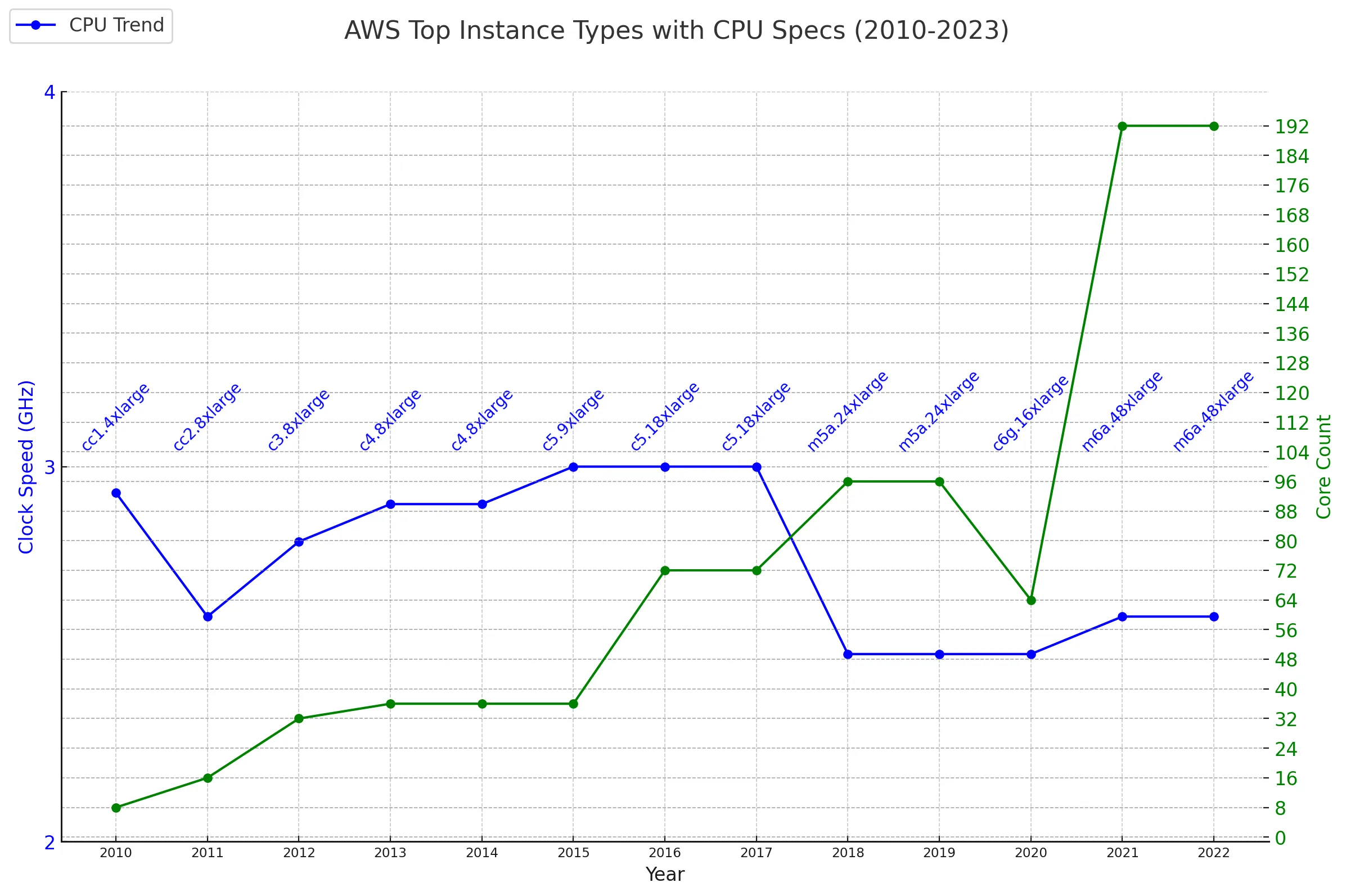 我们前面刚刚介绍了 CPU 发展的趋势。cpu 的单核主频是基本不变的,但是 core 数增加。