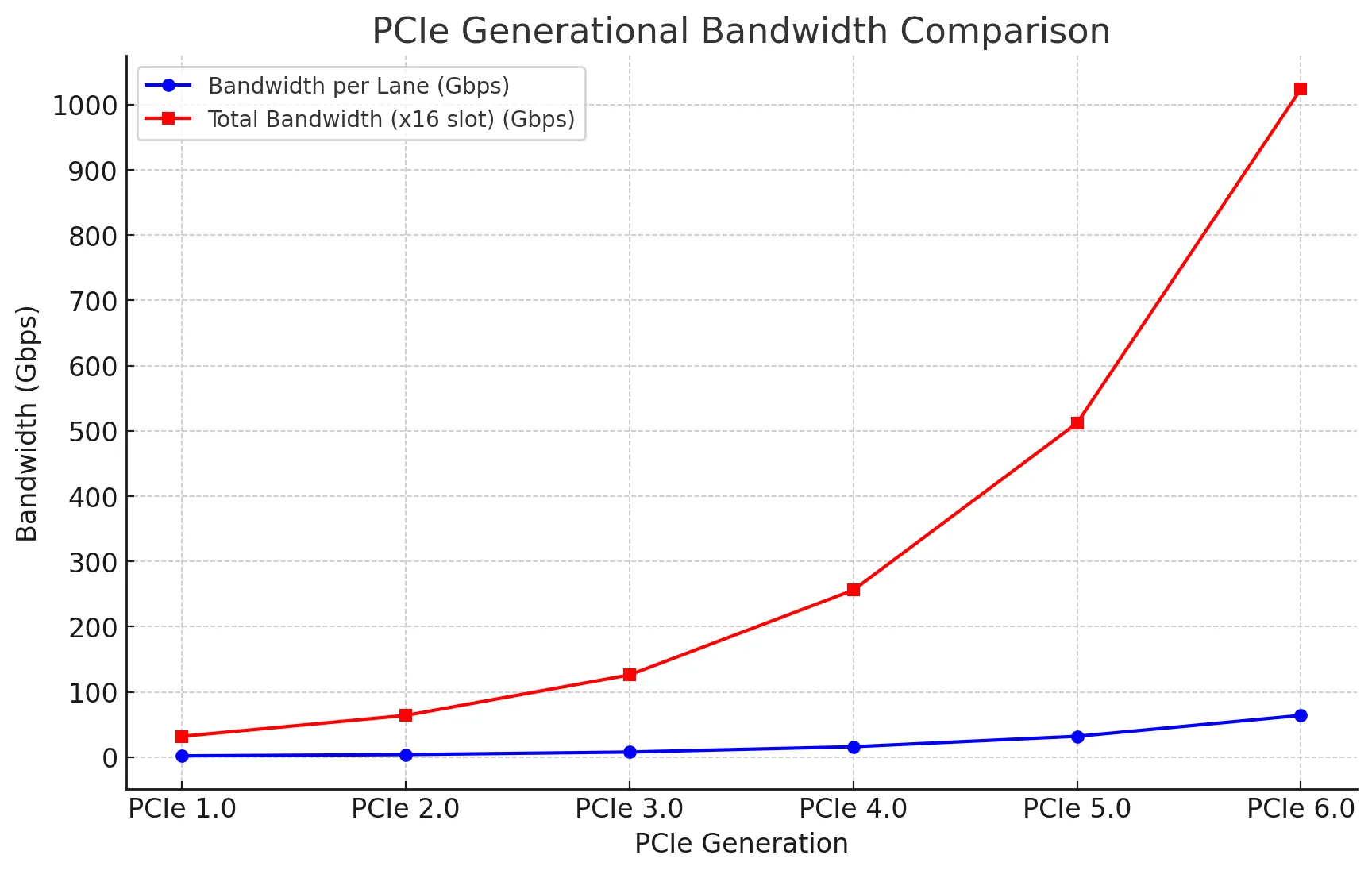 而且服务器是可以配置更多的网卡或者 SSD 磁盘的,就会几倍的放大上面的增量,瓶颈在于总线带宽。下面是 PCIe 总线的带宽变化图。